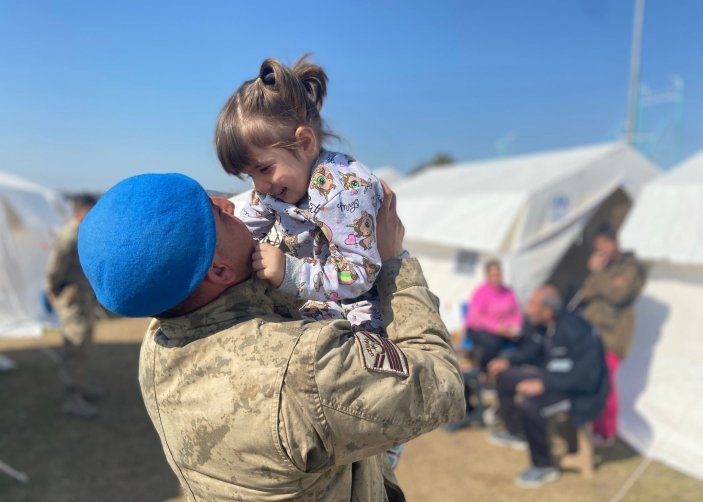 5. Jandarma hem depremzedeleri koruyor hem de çocukların yüzünü güldürüyor